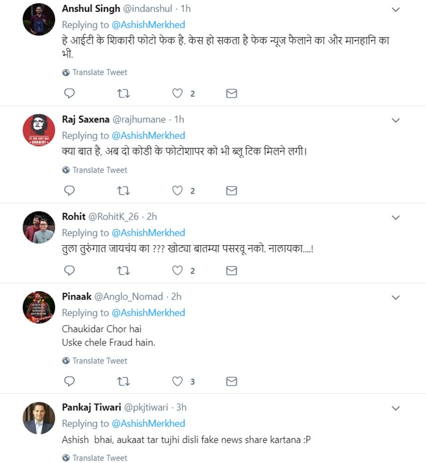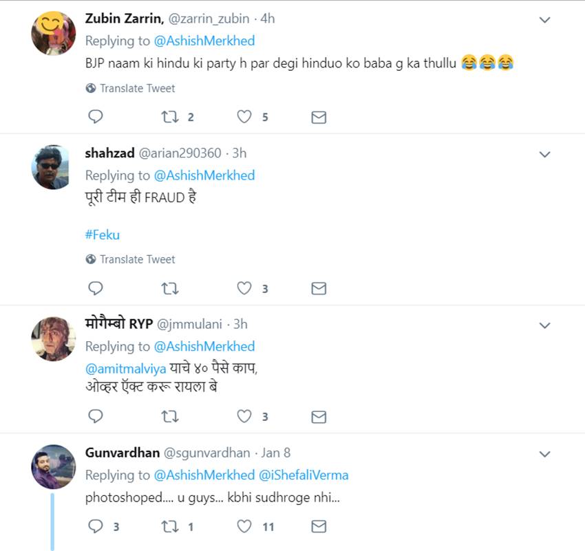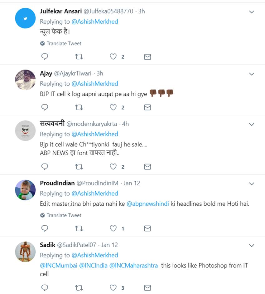 जुल्फिकार अंसारी ने ट्वीट कर लिखा, ‘फर्जी खबर है।’ अजय ने भी तंज कसने वाला ट्वीट किया। एक अन्य ट्वीट में लिखा गया, ‘एडिट मास्टर इतना भी पता नहीं कि एबीपी न्यूज की हेडलाइन बोल्ड होती है।’ सादित लिखते हैं, ‘आईटी सेल द्वारा फोटो शॉप से किया गया लगता है।’