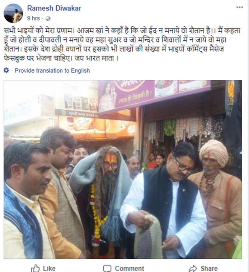 ‘जो ईद ना मनाए वो शैतान’। सपा नेता व पूर्व मंत्री आजम खान के इस बयान पर बीजेपी विधायक ने पलटवार किया है। उत्तर प्रदेश के औरैया से बीजेपी विधायक ने आजम पर निशाना साधते हुए कहा है कि जो होली-दिवाली ना मनाए वो महा सुअर। दरअसल प्रदेश के मुख्यमंत्री योगी आदित्य नाथ ने राज्य विधानसभा में कहा था कि मैं हिंदू हूं इसलिए ईद नहीं मनाता। सीएम सदन में एक पत्रकार के सवाल पर अपनी प्रतिक्रिया का जिक्र कर रहे थे। मुख्यमंत्री के इस बयान पर प्रतिक्रिया देते हुए आजम खान ने कहा कि जो ईद ना मनाए वो शैतान होता है। आजम खान का ये बयान मीडिया से लेकर सोशल मीडिया तक में वायरल हो गया। सपा नेता के इस बयान पर औरैया से बीजेपी विधायक रमेश दिवाकर के फेसबुक पेज से पलटवार किया गया है। इस फेसबुक पोस्ट में लिखा गया है – ‘सभी भाइयों को मेरा प्रणाम। आजम खान ने कहा है कि जो ईद न मनाये वो शैतान है। मैं कहता हूं जो होली व दीपावली न मनाये वह महा सुअर व जो मन्दिर व शिवालों में न जाये वो महा शैतान। इसके देश द्रोही बयानों पर इसको भी लाखों की संख्या में भाइयों कमेंट्स मैसेज फेसबुक पर भेजना चाहिए। जय भारत माता ।’