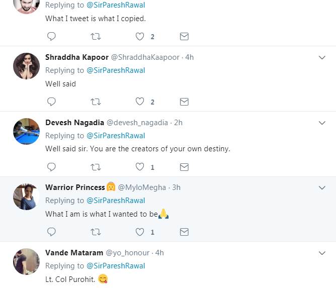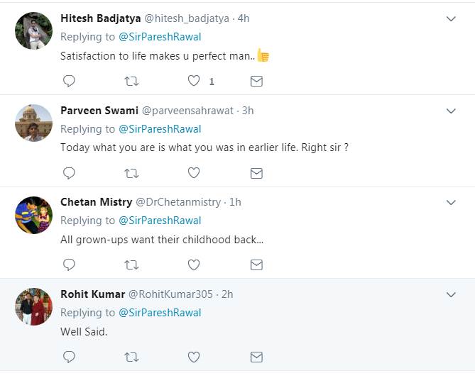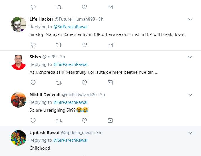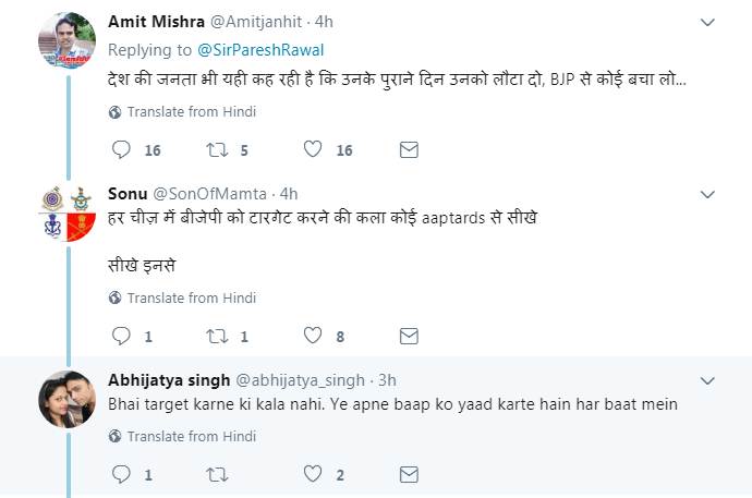 कुछ यूजर्स ने लिखा कि देश की जनता भी यही कह रही है कि उनके पुराने दिन लौटा दो, बीजेपी से कोई बचा लो। वहीं कुछ यूजर्स ऐसे बी रहे जो परेश रावल के इस ट्वीट को सिर्फ एक ट्वीट के नजरिए से देखते हुए उसी भाषा में कमेंट करने लगे।