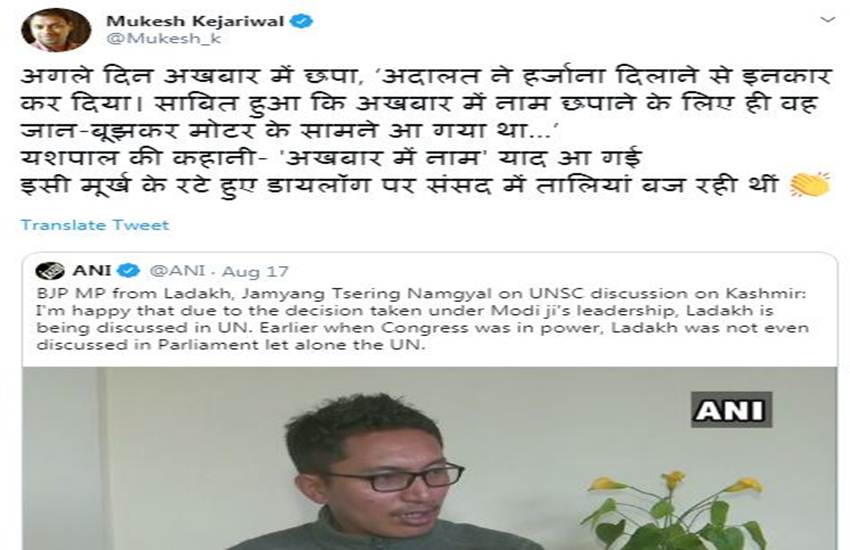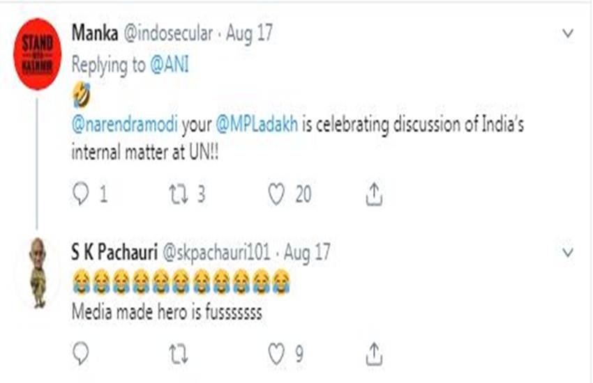 मालूम हो चीन के हस्तक्षेप के बाद सुंयक्त राष्ट्र सुरक्षा परिषद् में अघोषित बैठक का आयोजन किया गया था। इस बैठक में सिर्फ कश्मीर मुद्दे पर चर्चा की गई थी। बैठक के बाद संयुक्त राष्ट्र में भारत के स्थायी प्रतिनिधि सैयद अकबरुद्दीन ने कहा कि यह भारत का द्विपक्षीय मुद्दा है। लेकिन नामग्याल का यह बयान उनकी अज्ञानता को तो दर्शाता ही है, साथ ही ये कश्मीर मामले पर भारत के रुख के खिलाफ भी है। नामग्याल के बयान के बाद ट्वीटर यूजर्स ने अलग-अलग प्रतिक्रिया दी है। एक यूजर ने यशपाल की कहानी- ‘अखबार में नाम’ का जिक्र कर नामग्याल को मूर्ख करार दिया है।