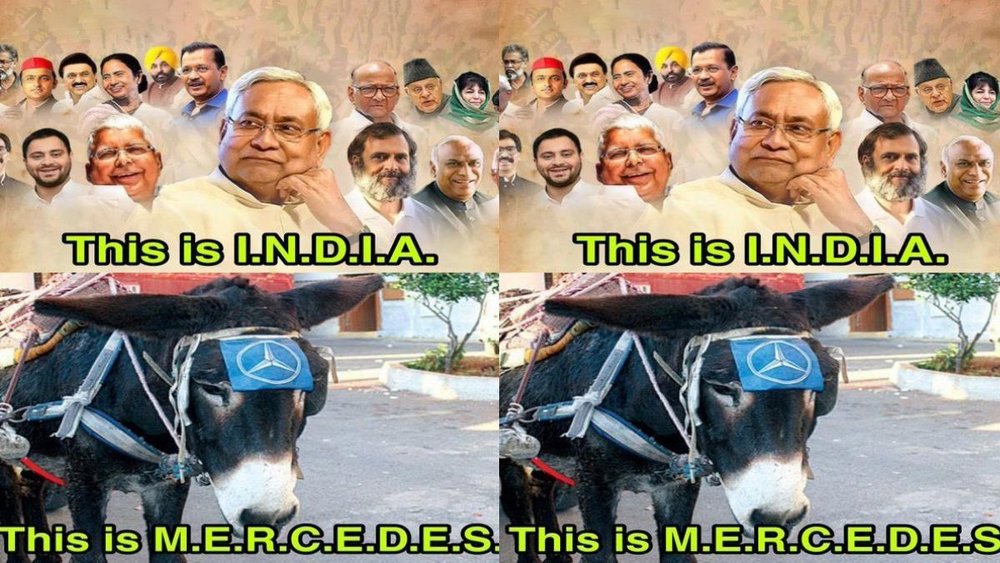 भाजपा सांसद मनोज तिवारी ने एक फोटो शेयर किया है, जिसमें एक हिस्से में विपक्ष के नेताओं की फोटो लगी हुई और लिखा गया है INDIA, फोटो के दूसरे हिस्से में गधे की फोटो है, जिस पर लिखा है MERCEDES। इस फोटो को शेयर कर मनोज तिवारी ने लिखा कि नाम बदलकर पहचान छिप सकती है क्या?