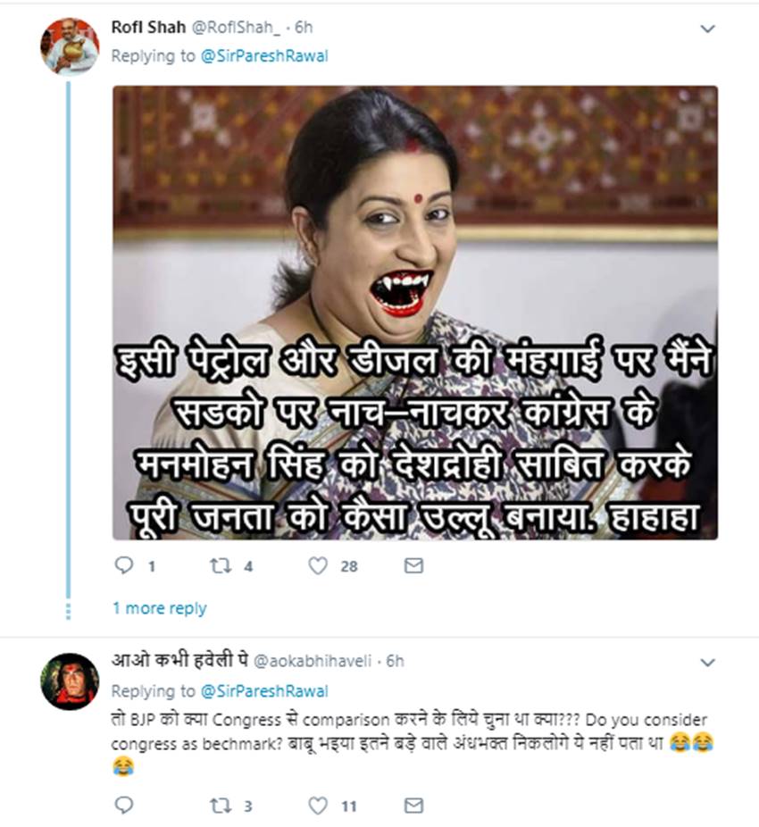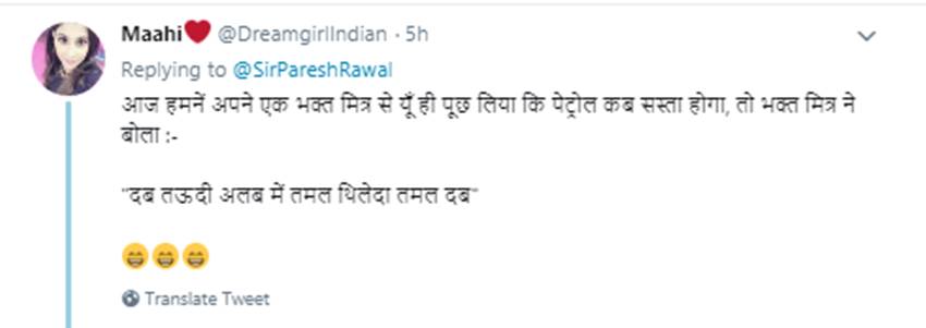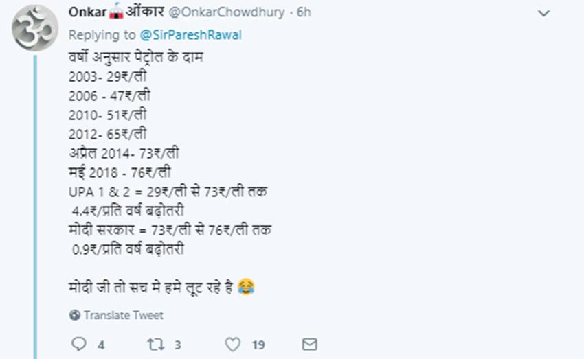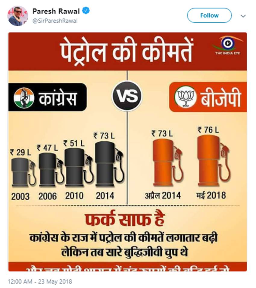 एक्टिंग से राजनीति में आए भारतीय जनता पार्टी (बीजेपी) के सांसद परेश रावल ने तेल के दाम पर एक पोस्ट शेयर किया, जिसके बाद वह सोशल मीडिया पर जमकर ट्रोल कर दिए गए। पोस्टर में पेट्रोल की कीमतों का ब्यौरा दिया गया था। अंतर दिखाया गया था कि कांग्रेस और बीजेपी के शासन में पेट्रोल की कीमतों में कितना इजाफा हुआ। बीजेपी सांसद ने जो पोस्टर शेयर किया, उसमें लिखा था कि फर्क साफ है- कांग्रेस राज में पेट्रोल की कीमतें लगातार बढ़ीं। लेकिन बुद्धिजीवी तब चुप थे।