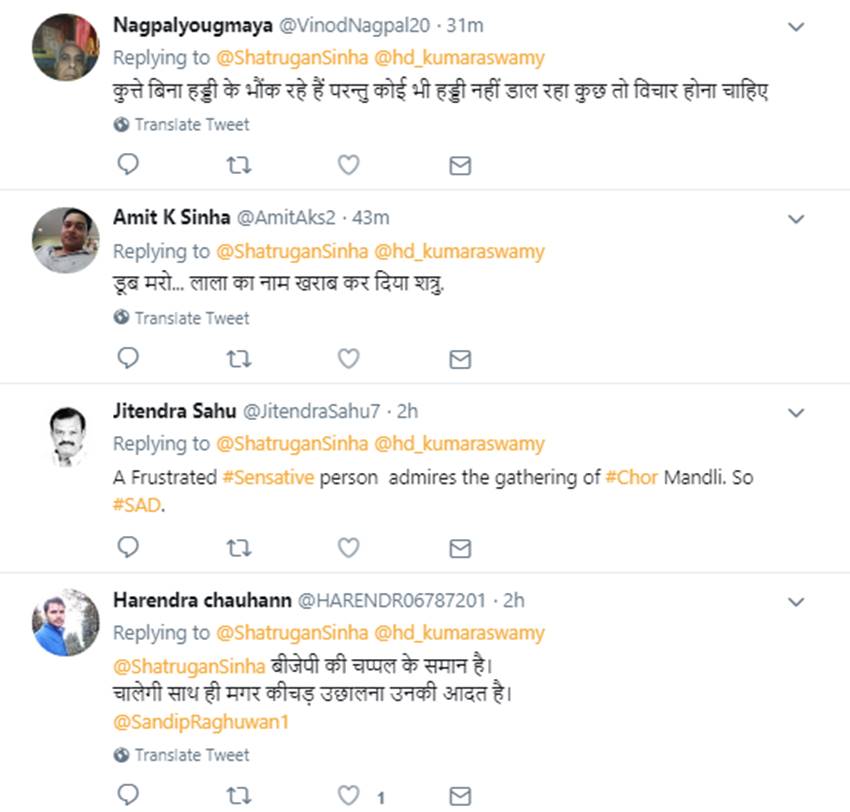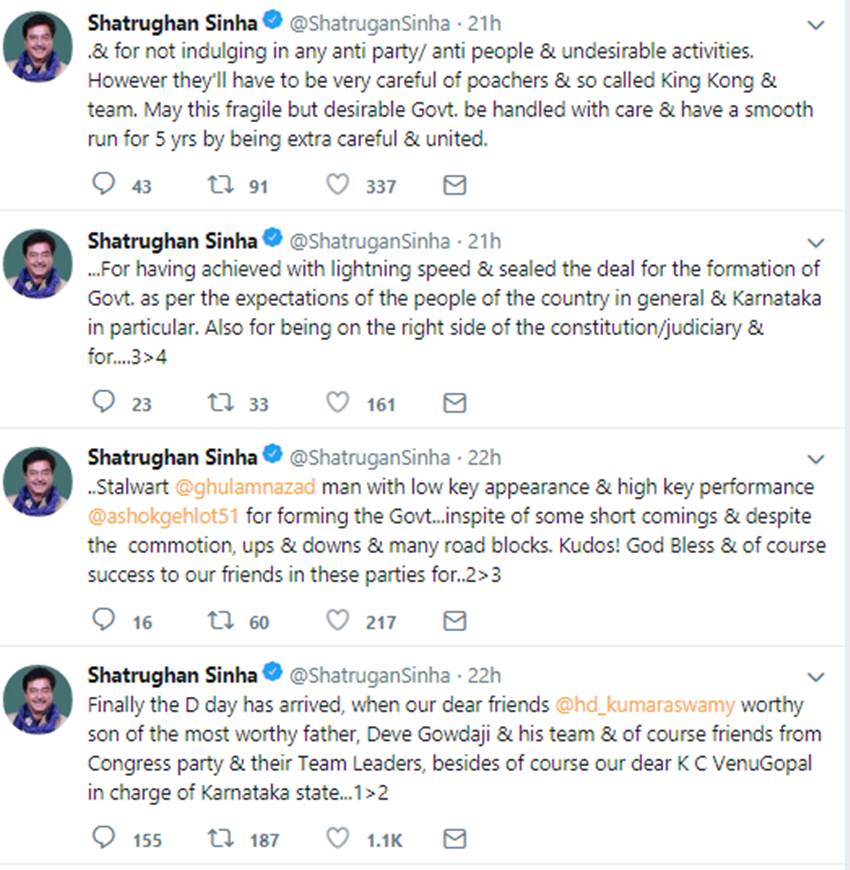 हुआ यूं कि शॉटगन ने बुधवार (23 मई) को कुछ ट्वीट किए। कहा, “आखिरकार वह दिन आ ही गया, जब मेरे प्रिय दोस्त एचडी कुमारस्वामी मुख्यमंत्री बन गए। वह काबिल पिता के योग्य बेटे हैं। देवगौड़ा जी, उनकी टीम, कांग्रेस व उनके नेताओं, कर्नाटक में कांग्रेस के प्रभारी केसी वेणुगोपाल, कांग्रेस महासचिव गुलाम नबी आजाद और अशोक गहलोत के प्रयास से वहां सरकार बनी।”