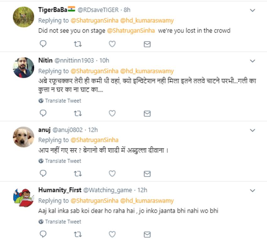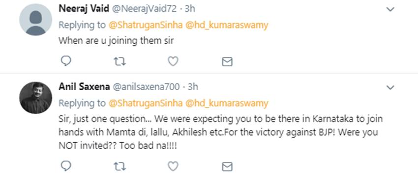 बता दें कि बुधवार (23 मई) को कर्नाटक में कांग्रेस-जेडीएस के गठबंधन की सरकार बनी। जेडीएस के कुमारस्वामी सीएम बने, जबकि कांग्रेस के जी.परमेश्वर ने उप-मुख्यमंत्री पद की शपथ ली थी। कार्यक्रम में विपक्ष के बड़े नेताओं का जमावड़ा लगा था। बड़ी पार्टियों के मुखियाओं से लेकर कई राज्यों के मुख्यमंत्री भी बेंगलुरू पहुंचे थे। मगर शत्रुघ्न उस दौरान कहीं नजर नहीं आए थे। लोगों ने इसी बात पर उनकी जमकर खिंचाई कर दी।