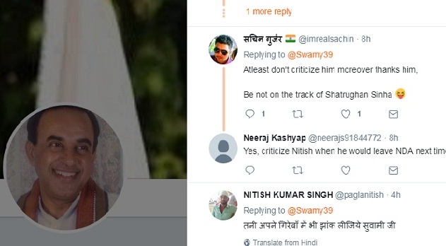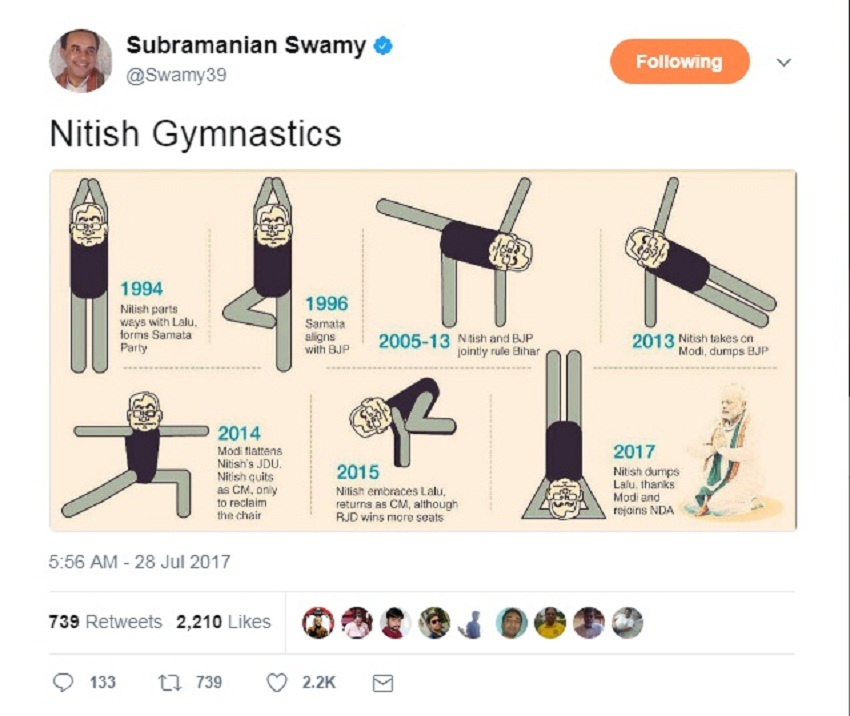भारतीय जनता पार्टी (बीजेपी) के सांसद सुब्रमण्यम स्वामी अपने बयानों के कारण अक्सर चर्चा में रहते हैं। स्वामी ने एक बार बर्र के छत्ते में हाथ डाल दिया है। स्वामी ने शुक्रवार (28 जुलाई) को बिहार में बीजेपी गठबंधन के साथ मिलकर सरकार बनाने वाले नीतीश कुमार का मजाक उड़ाता कार्टून ट्विटर पर शेयर किया है। दूसरी तरफ नीतीश कुमार के इस्तीफा देते ही प्रधानमंत्री नरेंद्र मोदी ने कुछ ही मिनटों बाद ट्विटर पर उन्होंने बधाई दी थी। बीजेपी नेता नीतीश के फैसले को “घर वापसी” बता रहे हैं, ऐसे में पार्टी के एक चर्चित सांसद द्वारा मजाक उड़ाना सबको हैरान कर गया। स्वामी बीजेपी के राज्य सभा सांसद हैं।