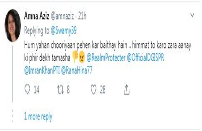 एक अन्य यूजर ने कहा ‘हम यहां चुड़ियां पहनकर नहीं बैठे हैं। हिम्मत तो करो जरा आने की फिर देखना तमाशा। एक यूजर ने कहा ‘आप तो ऐसे बोल रहे हैं जैसे एलओसी के पार लोग आपके लिए गुलाब लेकर खड़े होंगे। और आपका स्वागत करेंगे।’