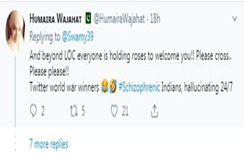 स्वामी के इस ट्वीट पर पाकिस्तानी ट्रोल्स आगबबुला हो गए। पाकिस्तानी ट्रोल्स ने तरह-तरह की प्रतिक्रिया दी है। एक यूजर ने कहा ‘आप एलओसी पार किसी को भेजिए तो सही, हमने विंग कमांडर अभिनंदन को तो जिंदा वापस भेजा दिया था लेकिन अब किसी इस तरह वापस नहीं भेजेंगे।’ वहीं एक यूजर ने कहा ‘हम उस दिन का इंतजार कर रहे हैं।’