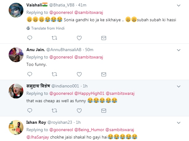 इस वीडियो को एक शख्स ने ट्विटर पर शेयर किया है, और इस पर जमकर प्रतिक्रियाएं मिल रही हैं। लंदनयोगिनी नाम के एक यूजर ने लिखा है, ‘संबित पात्रा के अंदर का एक्टर फुदक फुदक कर बाहर आ रहा है।’ एक यूजर ने लिखा, ‘ये संबित पात्रा के अंदर का टैलेंट है।’ एक यूजर ने लिखा, ‘ये मजाकिया तो था ही बकवास भी था।’ एक यूजर ने मजाकिया लहजे में लिखा, ‘संबित पात्रा 2019 तक रुक जाओ, राहुल गांधी तुम्हें अंग्रेजी बोर्डिंग स्कूल भेजेंगे।’ गिरिश साहनी ने कहा, ‘संबित पात्रा ये कौन सा हिन्दू चाल चलन है।’