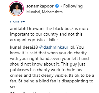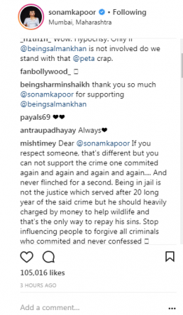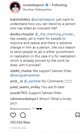 इंस्टाग्राम पर सोनम की सलमान खान के प्रति समर्थन जताने वाली पोस्ट पर एक यूजर ने कमेंट में लिखा- ”तुम पर लानत है! लगा था कि इंडस्ट्री में तुम बाकी लोगों के मुकाबले ज्यादा संवेदनशील हो। एक अपराधी का समर्थन करना तुम्हारी महानता नहीं दिखाता है और सार्वजनिक तौर पर ऐसे कृत्य को सराहना तुम्हारी छवि अच्छी करने बजाय खराब ज्यादा करता है।।”