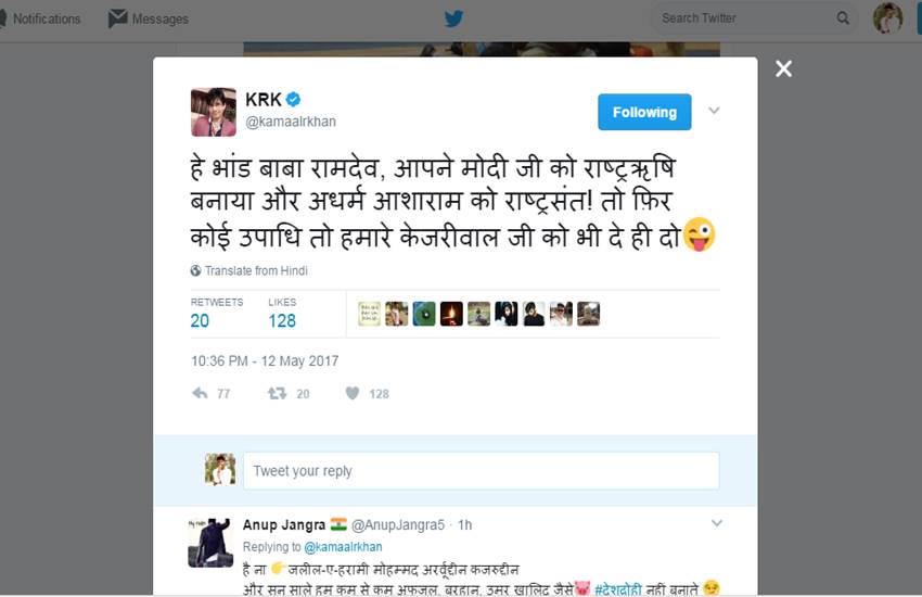 अपने ट्वीट से अक्सर विवादों में रहने वाले बॉलीवुड कलाकार कमाल राशिद खान जिन्हें लोग केआरके के नाम से भी जानते हैं, ने बाबा रामदेव के लिए बेहद आपत्तिजनक शब्दों का इस्तेमाल किया है। केआरके ने अपने एक ट्वीट में बाबा रामदेव को भांड कह कर संबोधित किया है। दरअसल केआरके ने अरविंद केजरीवाल के मजे लेते हुए एक ट्वीट किया। इस ट्वीट में केआरके ने लिखा- ‘हे भांड बाबा रामदेव, आपने मोदी जी को राष्ट्रऋषि बनाया और अधर्म आशाराम को राष्ट्रसंत! तो फ़िर कोई उपाधि तो हमारे केजरीवाल जी को भी दे ही दो’। आपको बता दें कि कमाल आर खान ने दो बॉलीवुड फिल्में की हैं। इनकी पहली फिल्म देशद्रोही थी तो दूसरी थी एक था विलेन। फिल्मों में केआरके ज्यादा कुछ तो नहीं कर पाए लेकिन अपने विवादित बयानों से वो हमेशा सुर्खियां बटोरते रहे हैं।