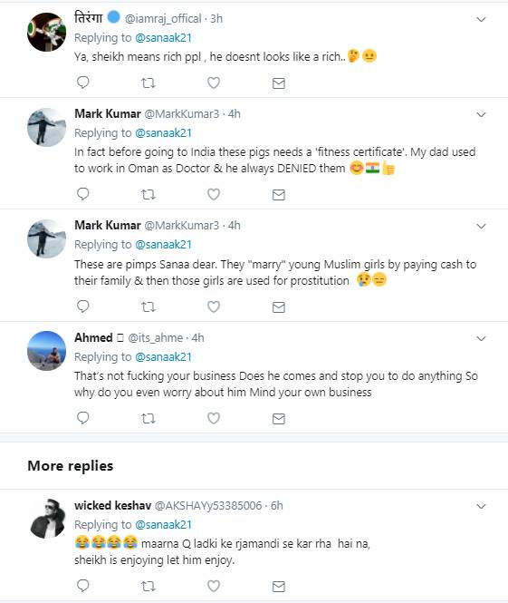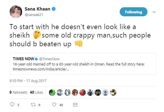 इसी मुद्दे पर सलमान और अक्षय कुमार जैसे सुपरस्टार्स के साथ फिल्मों में अपना धमाल मचा चुकी मुस्लिम एक्ट्रेस सना खान ने अपनी भड़ास निकाली है। सना खान ने कहा इस खबर के लिंक को ट्वीट करते हुए लिखा कि सबसे पहले तो ये 65 साल का बुड्ढा कहीं से भी शेख नजर नहीं आता है। ये कोई सनकी इंसान है। इसे तो पकड़कर जमकर पीटना चाहिए।