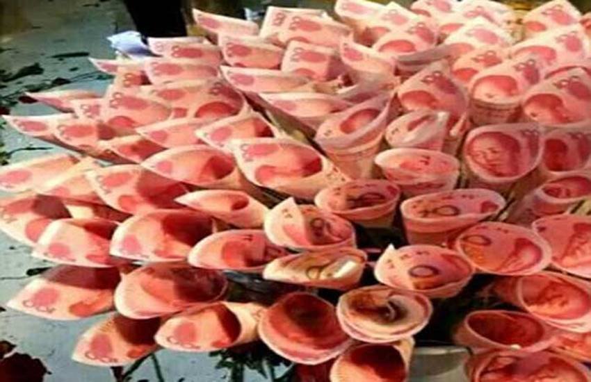 हिन्दुस्तान में आप शादी के दौरान दूल्हों को नोटों की माला पहने हुए जरूर देखा होगा। हालांकि आपने नोटों के गुलदस्ते को शायद ही देखा होगा। लेकिन चीन में एक शख्स ने अपनी गर्ल फ्रेंड को रिझाने के लिए यही गिफ्ट देने की सोची। इसके लिए इस शख्स को 3 लाख 30 हजार यूआन खर्च करने पड़े। भारतीय मुद्रा में ये रकम 35 लाख 70 हजार रुपये होती है। इससे जुड़ी तस्वीरें चीनी सोशल मीडिया पर वायरल हो रही है। इस तस्वीर में ये एक लड़की चीन के चोंगचिग शहर के एक फैंसी होटल में नोटों के गुलदस्ते के साथ खड़ी दिख रही है। रिपोर्ट के मुताबिक इतनी बड़ी रकम खर्च करने के बाद भी ये शख्स को जरा सा भी अफसोस नहीं है। बल्कि इस शख्स को खुशी है कि वह अपनी प्रेमिका को खुश कर सका।