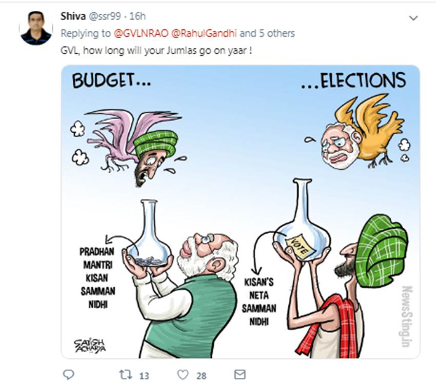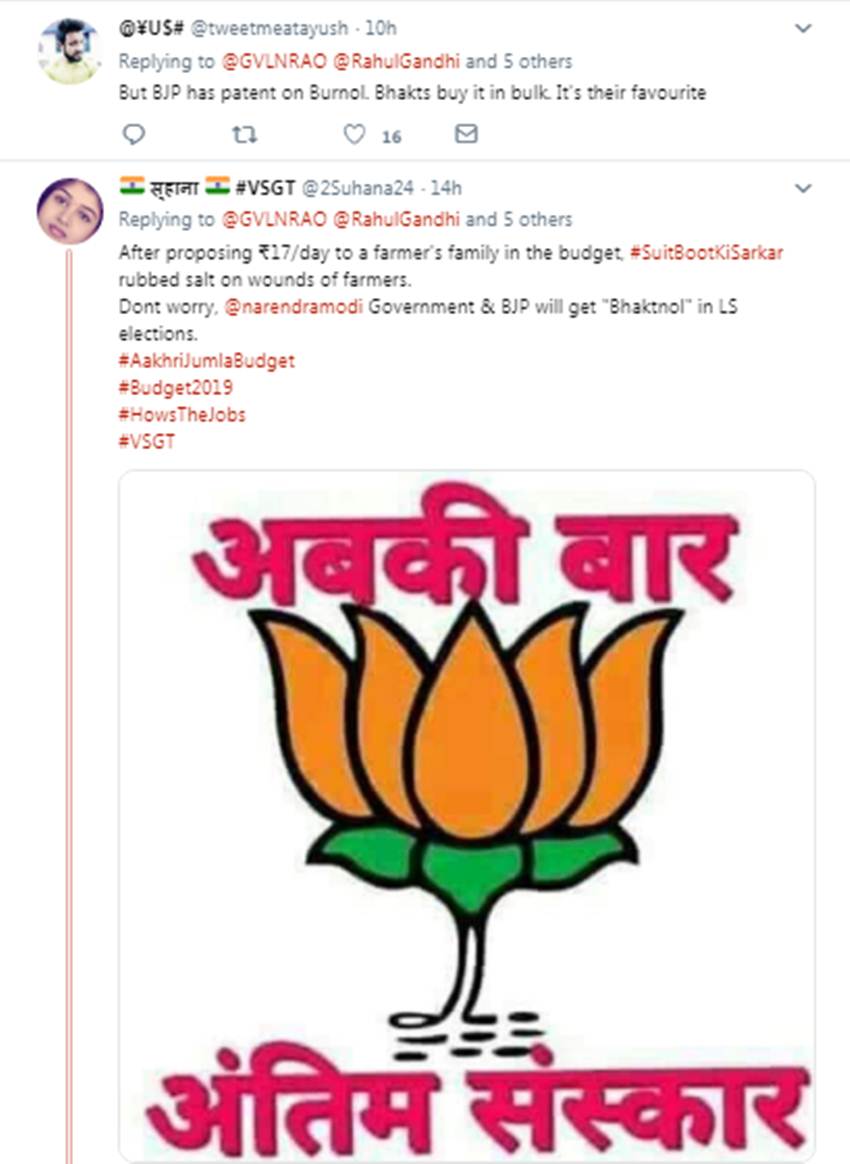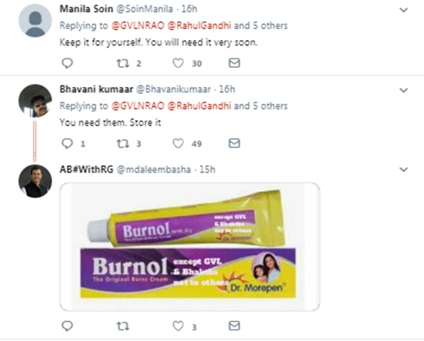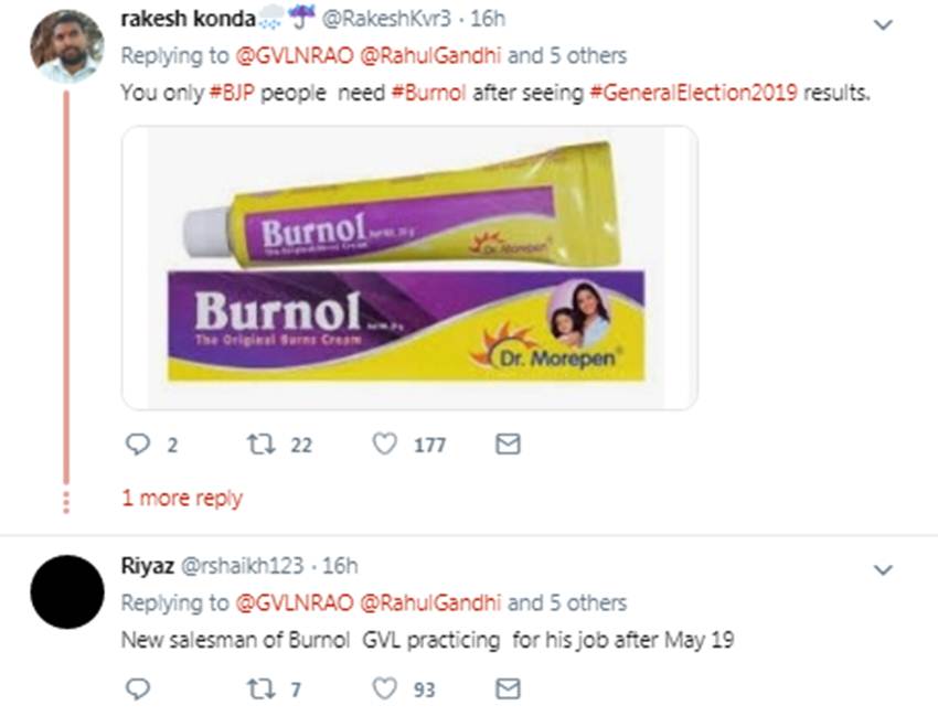 भारतीय जनता पार्टी (बीजेपी) के सांसद जीवीएल नरसिम्हा राव ने सोशल मीडिया पर विपक्षी नेताओं के लिए बरनॉल का फोटो पोस्ट किया था। शुक्रवार (एक फरवरी, 2019) को राव ने इसके साथ कहा कि विपक्षी नेताओं को हमारे बजट से जलन हो रही है, लिहाजा उन्हें इस क्रीम से कुछ राहत मिलेगी। यूजर्स ने इसी को लेकर सांसद को जमकर लताड़ा और ट्रोल करने की कोशिश की।