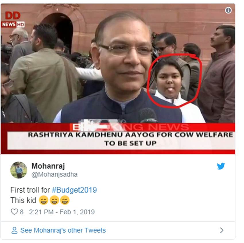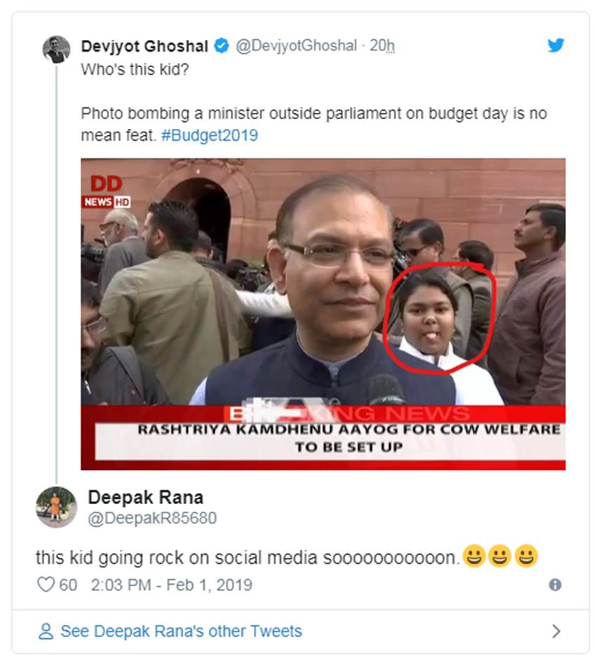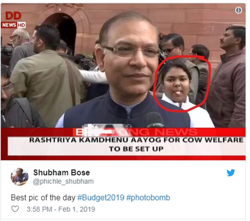 Budget 2019: केंद्रीय मंत्री जयंत सिन्हा शुक्रवार (एक फरवरी) को अंतरिम बजट के बाद मीडिया से बात कर रहे थे। सिन्हा के पीछे तब एक बच्ची खड़ी होकर मुंह बना रही थी। कैमरे की तरफ मुस्कुराते हुए वह अपनी जीभ बार-बार बाहर निकाल रखी थी, पर इस बात से मंत्री अनजान थे। सिन्हा का इंटरव्यू टीवी पर ऑन एयर होने के बाद कुछ लोगों ने बच्ची के मजाकिया हाव-भाव के फोटो और फुटेज सोशल मीडिया पर पोस्ट किए। देखते ही देखते वे वायरल हो गए। टि्वटर पर किसी ने बच्ची के बारे में पूछा, तो किसी ने इस घटना की तस्वीर को पिक्चर ऑफ द डे बताया।