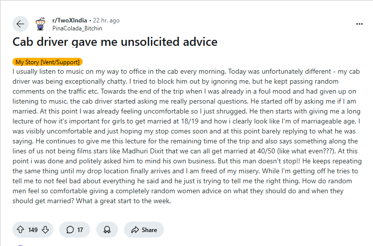 युवती ने पोस्ट में दावा किया कि उसे एक कैब ड्राइवर ने शादी करने की सही उम्र के बारे में अनचाही सलाह दी थी। इस पोस्ट ने सोशल मीडिया यूजर्स में गुस्सा और चिंता फैल गई। अपनी पोस्ट में, उसने दावा किया कि ड्राइवर ने उसके इग्नोर करने के बावजूद उससे बात करना जारी रखा, लड़कियों को 19 साल की उम्र में शादी कैसे करनी चाहिए, इस पर एक लंबा लेक्चर दिया और उससे कहा कि वो “शादी करने लायक उम्र” की लगती है।