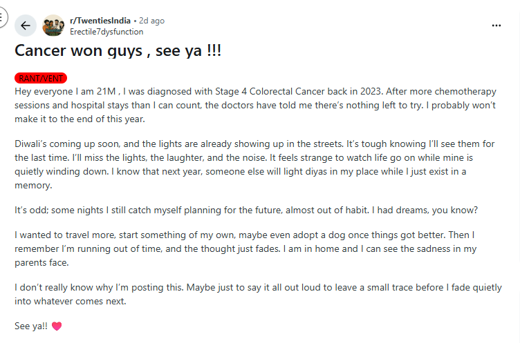 लड़के ने लिखा है “कैंसर जीत गया, दोस्तों, फिर मिलेंगे!!!” “सभी को नमस्कार, मैं 21 साल का हूं। मुझे 2023 में स्टेज 4 कोलोरेक्टल कैंसर का पता चला था। इतने कीमोथेरेपी सेशन और अस्पताल में रहने के बाद डॉक्टरों ने मुझे बताया है कि अब कुछ भी करने की ज़रूरत नहीं है। मैं शायद इस साल के अंत तक ज़िंदा नहीं रह पाऊंगा।”