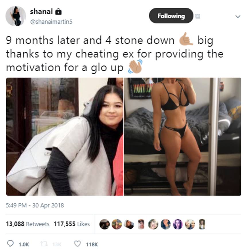 कोई रिश्ता टूटता है तो दिल को चोट पहुंचती है, मगर कई बार ऐसे झटके आपको जिंदगी में कुछ नया करने की प्रेरणा दे जाते हैं। ऐसा ही कुछ हुआ वेल्श (वेल्स देश के निवासी) छात्रा शनाय मार्टिन के साथ। 9 महीने पहले शनाया का उनके एक्स-ब्वॉयफ्रेंड से ब्रेकअप हुआ था। इसके बाद के समय में उन्होंने अपने फिगर पर ध्यान देना शुरू किया और अब वह साइज 16 से साइज 10 पर आ चुकी हैं। शरीर में इस शानदार बदलाव की उपलब्धि की जानकारी शनाया ने ट्विटर के जरिए दी तो दुनियाभर के यूजर्स उनकी तारीफ कर रहे हैं।