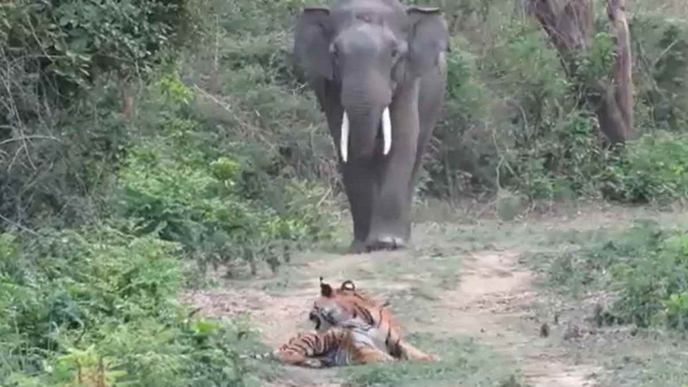 वीडियो में दिखाई दे रहा है कि जंगल की पगडंडी पर एक बाघ बैठा हुआ है। कुछ लोग इसका वीडियो बना रहे हैं। इसी दौरान एक विशालकाय हाथी धीरे-धीरे उसी पगडंडी से होते हुए बाघ की तरफ आता दिखाई दे रहा है। जैसे ही हाथी बाघ के करीब पहुंचता है और बाघ हाथी को देखता है तो वह तुरंत वहां से जंगल में भाग जाता है।