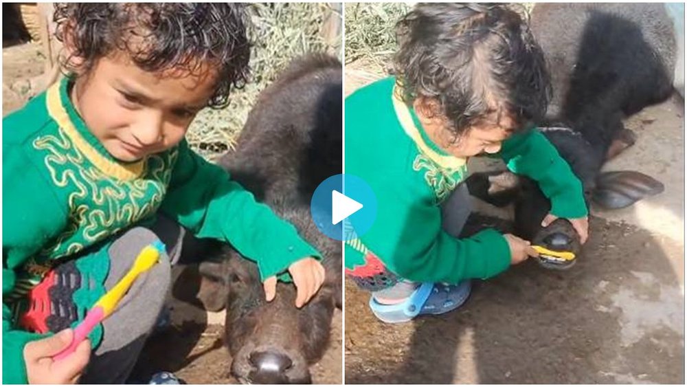 अक्सर बच्चियों को गुड़िया से खेलते हुए देखा जा सकता है। छोटी बच्ची गुड़िया को नहलाती हैं, उसे तैयार करती हैं और उसका मेकअप करती हैं, लेकिन इस वायरल वीडियो में देखा जा सकता है कि यह मासूम सी बच्ची भैंस के बछड़े के साथ इस तरह खेल रही है कि मानो वहीं उसके लिए गुड़िया है। बच्ची भैंस के बछड़े को ब्रश करा रही है। बच्ची के चेहरे पर न तो कोई डर है और न ही किसी तरह की घबराहट बल्कि बछड़े को डर और घबराहट में देखा जा सकता है।