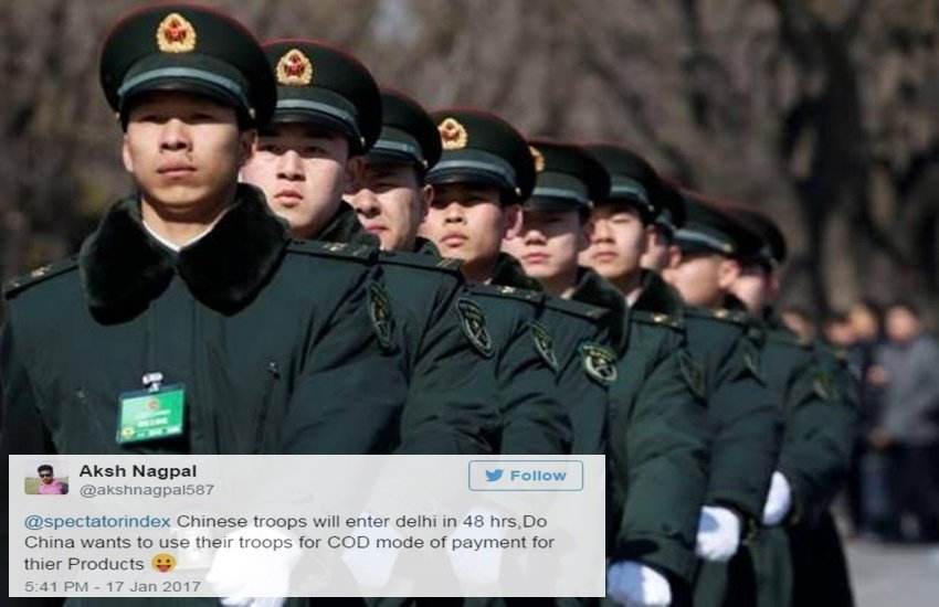 @spectatorindex Chinese troops will enter delhi in 48 hrs,Do China wants to use their troops for COD mode of payment for thier Products ?