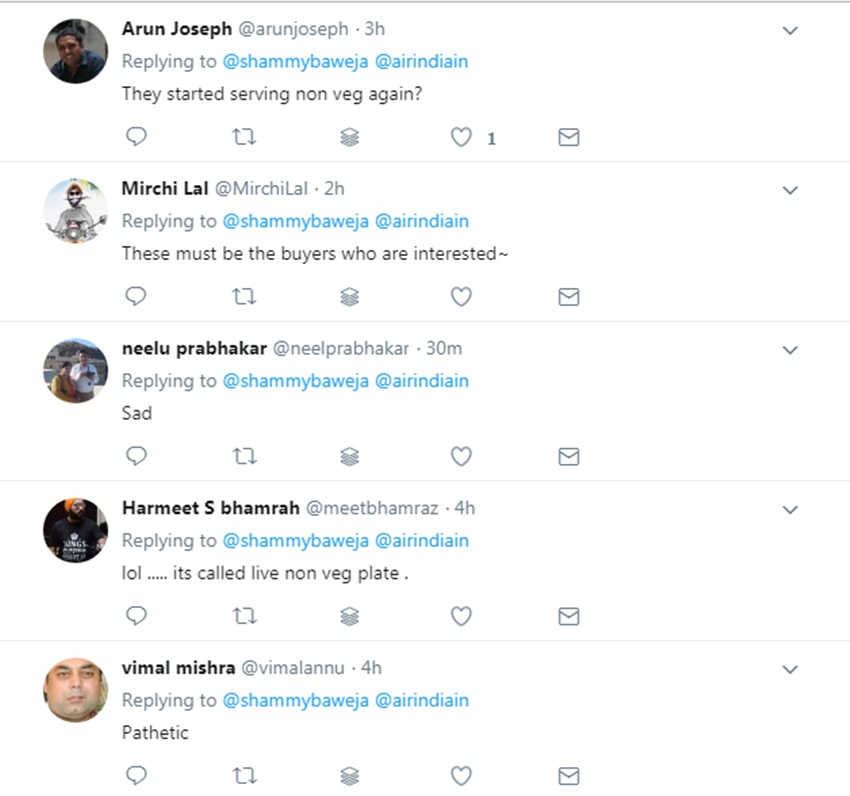 तस्वीर में खाने की प्लेट पर कॉक्रोच था। फिर क्या था, टि्वटर पर जैसे ही अन्य यूजर्स की इस ट्वीट-तस्वीर पर नजर पड़ी। लोगों ने एयरलाइन कंपनी का मजाक उड़ाना शुरू कर दिया। देखिए लोगों ने कैसे एयर इंडिया का सोशल मीडिया पर मजाक बनाया-
