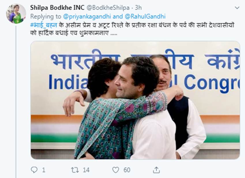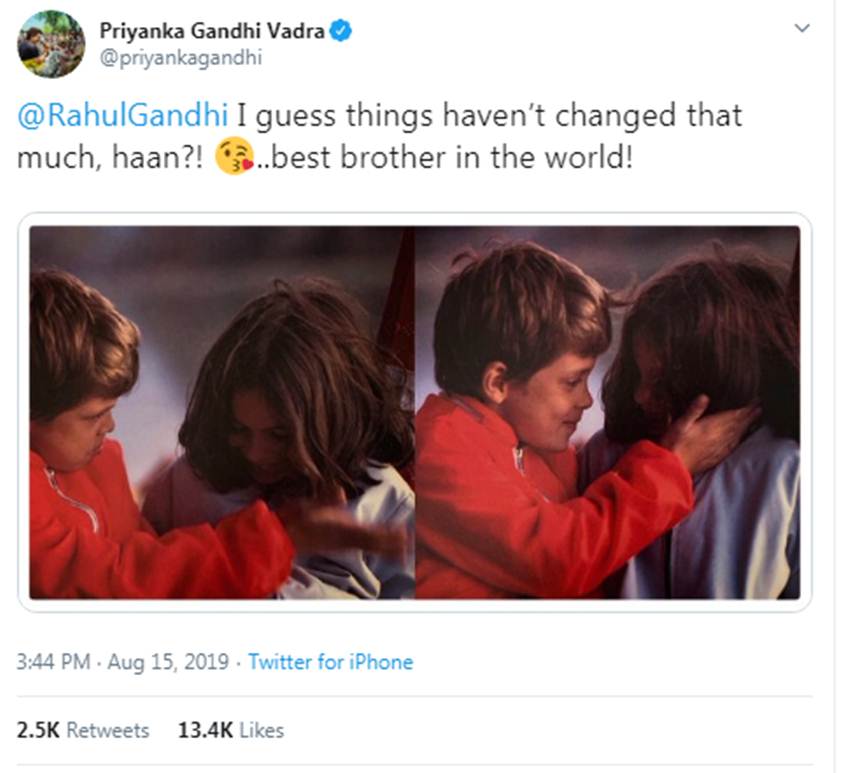 कांग्रेस महासचिव प्रियंका गांधी वाड्रा ने गुरुवार (15 अगस्त, 2019) को रक्षाबंधन पर भाई राहुल गांधी के लिए एक प्यारा सा ट्वीट किया। उन्होंने इसके साथ ही लगभग तीन दशक पुराना भाई के साथ अपना फोटो शेयर किया था। राहुल इसमें उन्हें प्यार-दुलार करते और पुचकारते दिख रहे थे। प्रियंका ने पुरानी यादों को ताजा करते हुए राहुल के लिए लिखा कि वह दुनिया के सबसे अच्छे भाई हैं।