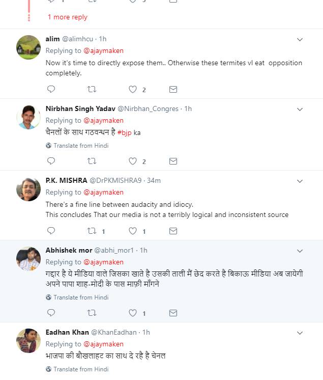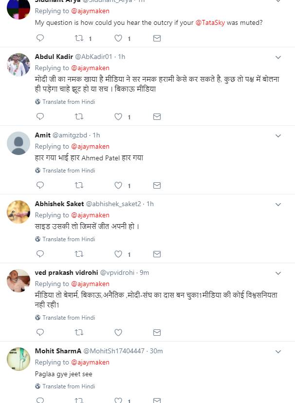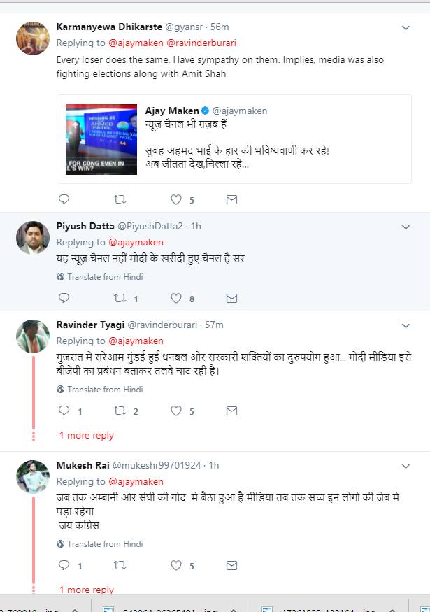मंगलवार को गुजरात में हुए राज्यसभा चुनावों के परिणाम पर कांग्रेस के पीर्व सांसद और केंद्रीय मंत्री अजय माकन ने न्यूज़ चैनलों पर निशाना साधा है। अजय माकन ने अंग्रेजी न्यूज चैनल की एक खबर का स्क्रीनशॉट शेयर करते हुए समाचार चैनलों को शर्म करने की बात कही है। अजय माकन ने ट्वीट करते हुए लिखा है कि न्यूज़ चैनल भी ग़ज़ब हैं, सुबह अहमद भाई के हार की भविष्यवाणी कर रहे थे। अब जीतता देख चिल्ला रहे हैं कि “पटेल की जीत में भी कांग्रेस की हार”। शर्म करो। अजय माकन का ट्वीट उस वक्त आया जब राज्यसभा चुनावों की गिनती शुरू होने ही वाली थी। अजय माकन के इस ट्वीट पर लोगों ने भी उनसे सहमति जताई। ऐसे लोगों ने बी समाचार चैनलों पर हमला करते हुए लिखा कि ये सब अमित शाह से डरे हुए हैं और बीजेपी के हाथों बिके हुए हैं।