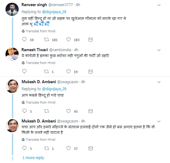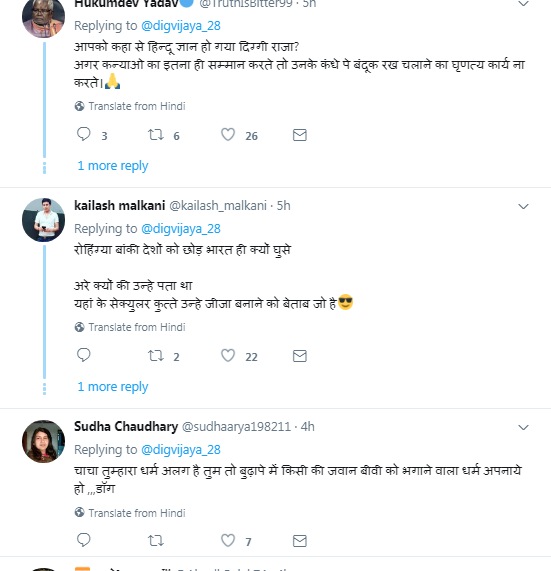 दिग्विजय सिंह का ये ट्वीट देख लोगों ने उन्हीं की क्लास लगाना शुरू कर दिया। लोग लिखने लगे कि तुम वहीं हिंदू हो ना जो सड़क पर खुलेआम गौमाता को मार कर खा गए। वहीं कुछ लोग दिग्विज सिंह पर बेहद निजी हमले करने लगे। देखिए किस तरह से दिग्विजय सिंह के ट्वीट पर उन्हें ट्रोल किया गया।
