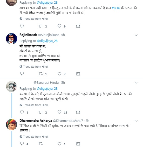 बनारस हिन्दू विश्वविद्यालय में गुरुवार को हुई कथित छेड़खानी के विरोध में धरना प्रदर्शन के बाद लड़कियों पर पुलिस के लाठीचार्ज से मामला बिगड़ गया। सोशल मीडिया पर विभिन्न राजनैतिक दलों व सामाजिक संगठनों के अलावा, सामान्य नागरिक भी अपना गुस्सा जाहिर कर रहे हैं। इसी कड़ी में कांग्रेस पार्टी के महासचिव दिग्विजय सिंह ने भी इशारों में भारतीय जनता पार्टी पर निशाना साधा है। हालांकि दिग्विजय सिंह को ही लोग भला-बुरा कहने लगे। देखते ही देखते दिग्विजय सिंह ट्रोल होने लगे। दरअसल हुआ ये कि बीएचयू में लड़कियों पर लाठीचार्ज को लेकर दिग्विजय सिंह ने ट्वीट करते हुए लिखा- हम हिन्दू तो नवरात्रि में कन्या भोज कराते हैं उनके पैर छूते हैं दान देते हैं, यह हिंदुओं का धर्म है और परम्परा है।