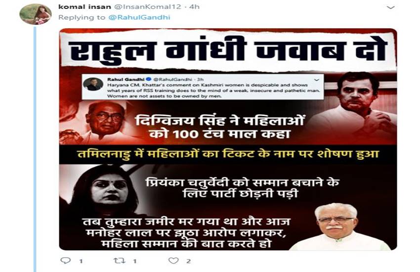 राहुल गांधी के इस ट्वीट पर यूजर्स गड़े मुर्दे उखाड़ने लगे। राहुल और खट्टर समर्थकों ने कांग्रेस और बीजेपी नेताओं के पुराने बयानों का जिक्र किया। किसी ने कहा कि कांग्रेस के वरिष्ठ नेता दिग्विजय सिंह ने अपनी ही पार्टी सांसद पर आपत्तिजनक टिप्पणी की थी तो किसी ने उत्तर प्रदेश के सीएम योगी आदित्यनाथ के महिलाओं पर दिए पुराने बयान का जिक्र किया।
