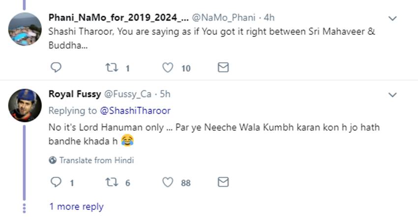कांग्रेसी नेता के इस ट्वीट पर लोगों ने भी अपनी प्रतिक्रियाएं दीं। कहा, “हम इन्हें याद न दिलाएं, इसलिए यह (थरूर) सुबह से तस्वीर की पुष्टि करा रहे थे।” वहीं एक अन्य यूजर ने लिखा, “आप तो इस तरह से कह रहे हैं जैसे आपने श्री महावीर और बुद्ध के बीच सही चुना हो।” रॉयल फुस्सी नाम के हैंडल से कहा गया, “नहीं यह तो हनुमान ही हैं पर ये नीचे वाला कुंभकरण कौन है, जो हाथ बांधे खड़ा है।” देखिए कुछ ऐसे ही ट्वीट्स-