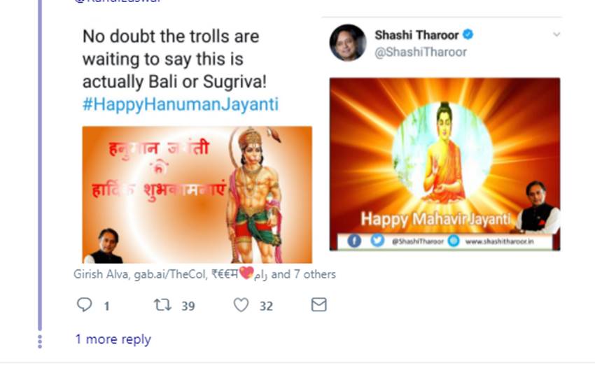 तिरुवनंतपुरम से कांग्रेस सांसद ने हनुमान जयंती (31 मार्च) पर भी लोगों को बधाई दी। लेकिन इस बार थोड़ा सावधानी के साथ। उन्होंने इस बाबत शुक्रवार (30 मार्च) की रात एक ट्वीट किया। उन्होंने इसमें भगवान हनुमान की तस्वीर पोस्ट की थी। केसरिया रंग के बैकग्राउंड पर लिखा था- हनुमान जयंती की हार्दिक शुभकामनाएं। साथ में उन्होंने लिखा, “मुझे कोई शक नहीं है कि ट्रोल्स इसे देखकर असल में बाली या फिर सुग्रीव बताने का इंतजार कर रहे होंगे।”