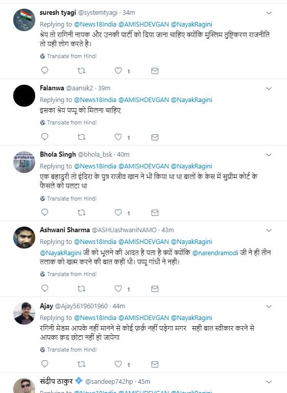 इस बारे में एक ट्वीट पर रागिनी नायक को लोगों ने खूब खरी-खोटी सुनाई। रागिनी नायक को कोसते हुए कुछ यूजर्स ने लिखा कि जरा कांग्रेस की इन प्रवक्ता से पूछा जाना चाहिए कि चंद वोटों के लिए उनकी सरकार ने क्यों कोर्ट के फैसले को पलट दिया था। वहीं कुछ अन्य यूजर्स ने लिखा कांग्रेस को तो बोलने का अधिकार ही नहीं है।
