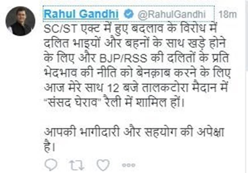 कांग्रेस उपाध्यक्ष राहुल गांधी ने सोमवार (23 अप्रैल) को नई दिल्ली के तालकटोरा स्टेडियम में ‘संविधान बचाओ रैली’ को संबोधित किया। हालांकि इस बारे में लोगों को जानकारी देते समय ट्विटर पर उनसे चूक हो गई। उन्होंने रैली का नाम गलत लिखते हुए उसे ‘संसद घेराव’ रैली लिख दिया। कुछ ही मिनटों बाद इस ट्वीट को डिलीट कर दिया गया और उसकी जगह ‘संविधान बचाओ’ रैली के साथ ट्वीट किया गया। कांग्रेस के ‘संविधान बचाओ’ अभियान का मकसद संविधान एवं दलितों पर कथित हमलों के मुद्दे को राष्ट्रीय स्तर पर जोरशोर से उठाना है।
