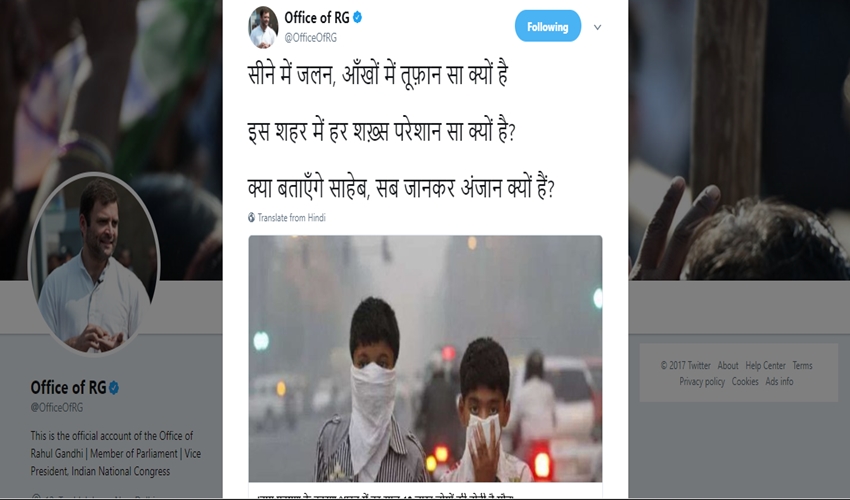 दिल्ली एनसीआर में जहरीले स्मॉग और प्रदूषण पर कांग्रेस उपाध्यक्ष राहुल गांधी ने बड़े ही शायराना अंदाज में पीएम नरेंद्र मोदी की चुटकी ली है। राहुल ने ट्वीट कर पीएम मोदी पर हमला बोला है। दरअसल पिछले सप्ताह से ही दिल्ली-एनसीआर में धुंध से बुरा हाल है। जहरीली धुंध के कारण कई दिनों तक दिल्ली में स्कूल भी बंद रहे थे। सोमवार को प्रदूषण के मुद्दे पर ही एनजीटी में सुनवाई चल रही है, सुनवाई के दौरान एनजीटी ने दिल्ली सरकार को फटकार लगाई है। सुनवाई में दिल्ली सरकार का कोई भी वकील नहीं पहुंच पाया था। इस जहरीले धुंध और प्रदूषण के चलते लगातार सरकार की निंदा हो रही है। इस मुद्दे पर राजनीति भी जमकर हो रही है। कांग्रेस उपाध्यक्ष राहुल गांधी ने प्रदूषण के मुद्दे पर ही प्रधानमंत्री नरेंद्र मोदी पर हमला बोला। राहुल ने शायरना अंदाज में लिखा, ‘सीने में जलन, आंखों में तूफ़ान सा क्यों है इस शहर में हर शख़्स परेशान सा क्यों है? क्या बताएंगे साहेब, सब जानकर अंजान क्यों हैं?’