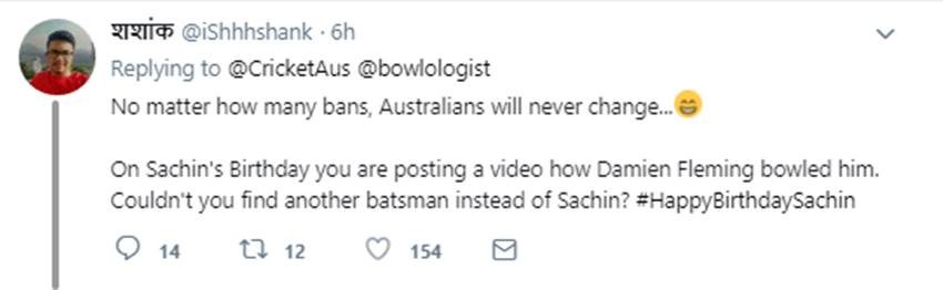 भारत के पूर्व क्रिकेटर सचिन तेंदुलकर के जन्मदिन पर ऑस्ट्रेलियाई क्रिकेट बोर्ड को एक ट्वीट करना बेहद भारी पड़ गया। ट्वीट में सचिन के आउट होने की वीडियो क्लिप थी। क्रिकेट फैन्स और सोशल मीडिया यूजर्स इसी ट्वीट पर क्रिकेट ऑस्ट्रेलिया (सीए) पर बुरी तरह भड़क उठे। लोगों ने कहा कि कंगारू क्रिकेटर्स कभी नहीं बदलेंगे। आप मास्टर ब्लास्टर के जन्मदिन पर इस तरह की हरकतें करते हैं। यही नहीं, कुछ फैन्स ने जवाब में वो क्लिपिंग अपलोड कीं, जिनमें सचिन ने ऑस्ट्रेलिया के एक गेंदबाज की धुलाई की थी।
