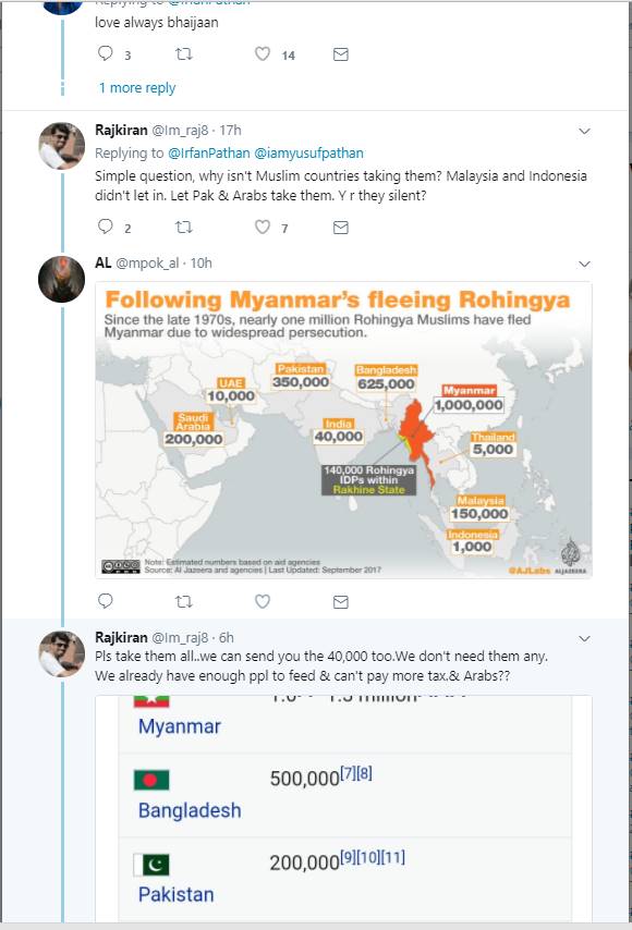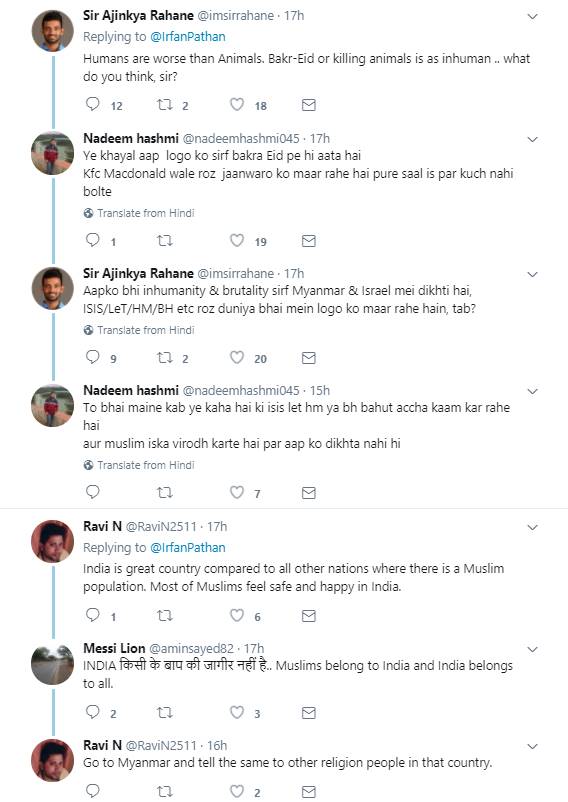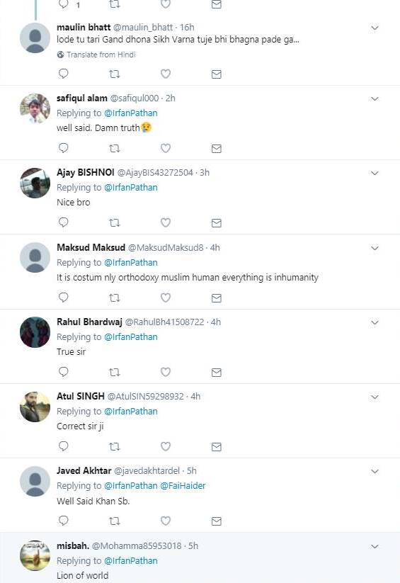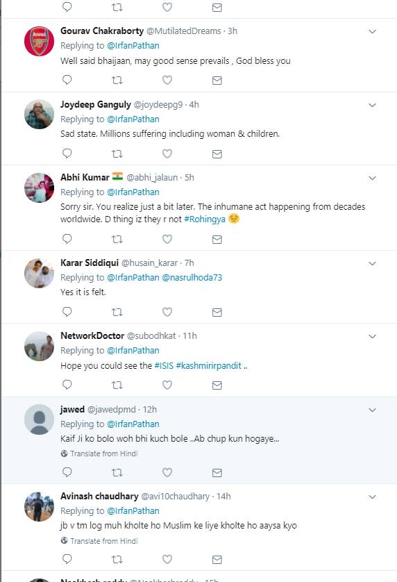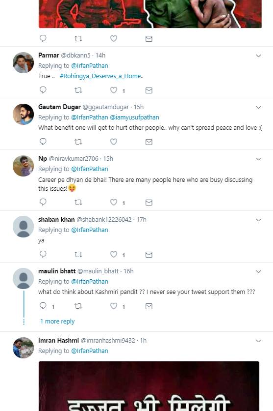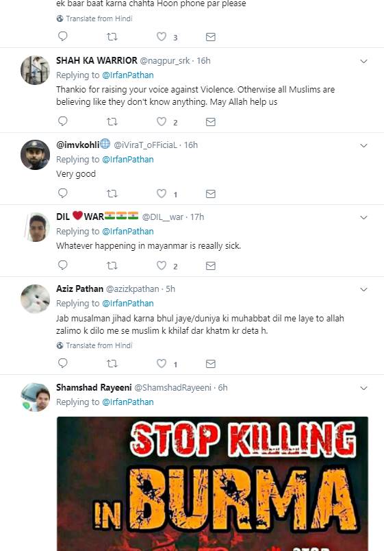 इरफान पठान ने अपने इस ट्वीट में म्यांमार नरसंहार का हैश टैग भी इस्तेमाल किया है। इरफान पठान का ये ट्वीट देख बहुत से लोगों ने उनसे असहमति जताई है। ऐसे लोग कह रहे हैं कि भारत दुनिया में मुसलमानों के लिए सबसे सुरक्षित जगह है। ये लोग पठान को लिख रहे हैं कि तुम करियर पर ध्यान दो इस तरह की बहस के लिए बहुत से लोग हैं। इन लोगों ने ये भी लिखा कि जब भी तुम लोग मुंह खोलते हो मुसलमानों के लिए ही खोलते हो। ऐसे ही कुछ दूसरे यूजर्स ने लिखा कि इन रोहिंग्या मुसलमानों को कोई मुस्लिम देश अपने पास लेने को तैयार क्यों नहीं हो रहा। बहुत से यूजर्स ने पठान के इस ट्वीट पर सहमति भी जताई है। इन यूजर्स ने लिखा कि इस हिंसा के खिलाफ आवाज़ उठाने के लिए आपका शुक्रिया। वहीं कुछ यूजर्स ये भी लिख रहे हैं कि जिस दिन मुसलमान हिंसा का रास्ता छोड़ प्यार और सद्भाव की बात करेगा उस दिन अपने आप ये सारी चीजें रुक जाएंगी।