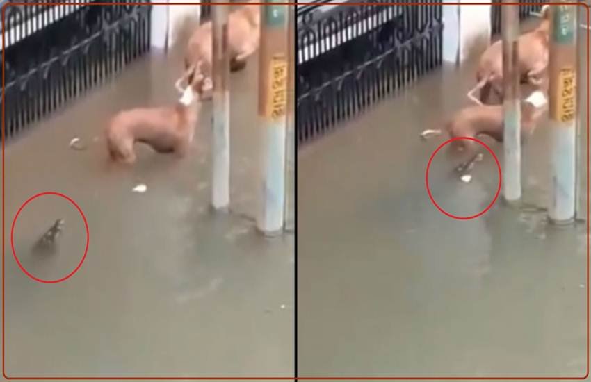 वीडियो में साफ दिख रहा है कि किसी सड़क के किनारे दो कुत्ते खड़े हैं। सड़क पानी से लबालब है। वहीं एक मगरमच्छ भी तैरता दिख रहा है। मगरमच्छ धीरे-धीरे कुत्ते के पास पहुंचता है और उसपर हमला बोल देता है। लेकिन कुत्ते की किस्मत अच्छी थी कि वह मगरमच्छ की पकड़ में नहीं आता है और वहां से भाग जाता है।