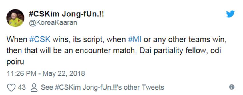 उन्होंने लिखा, “चिल करिए। जब कोई अच्छा खेलता है तब हम कहते हैं- वाह! उन्होंने क्या स्क्रिप्ट लिखी है! जब कोई कलाकार-खिलाड़ी लगातार बढ़िया प्रदर्शन करता है, तब हम बोलते हैं- किसने उसकी स्क्रिप्ट लिखी। और इस ट्वीट का मतलब भी कुछ ऐसा ही है- वाह! सीएसके, आपने ये मुकाबले अन्य टीमों की तुलना में अच्छे से खेले हैं।”