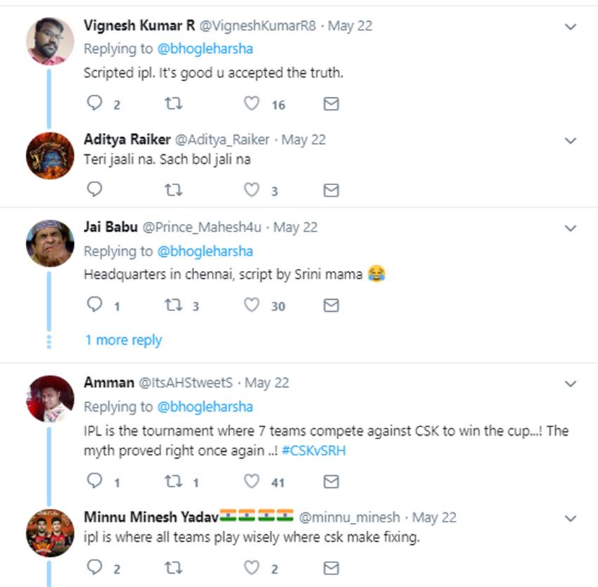 लोगों ने भोगले के इस ट्वीट का मतलब निकाला कि वह चेन्नई पर तंज कसते हुए आरोप लगाना चाह रहे थे। कहना चाह रहे थे कि धोनी की टीम ने यह मैच फिक्स किया था। लोगों ने इसी के बाद उन्हें खूब खरी-खोटी सुनाई। देखिए लोगों की प्रतिक्रियाएं-