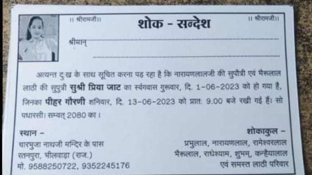 इसके बाद परिवार ने बेटी के नाम का एक शोक संदेश छपवाया है और उसे अपने जाननेवालों और रिश्तेदारों को भिजवाया है। 13 दिन बाद लड़की का मृत्युभोज रखा गया है। शोक संदेश में लिखा गया है, “अत्यंत दुख के साथ सूचित करना पड़ रहा है कि नारायणलालजी की सुपौत्री एवं भैरूलाल लाठी जी की सुपुत्री सुश्री प्रिया जाट का स्वर्गवास दि 1 जून 2023 को हो गया है, जिनका पीहर गौरणी शनिवार दि 13 जून 2023 को प्रातः 9 बजे रखी गई है। सो पधारसी सम्वत 2080!”