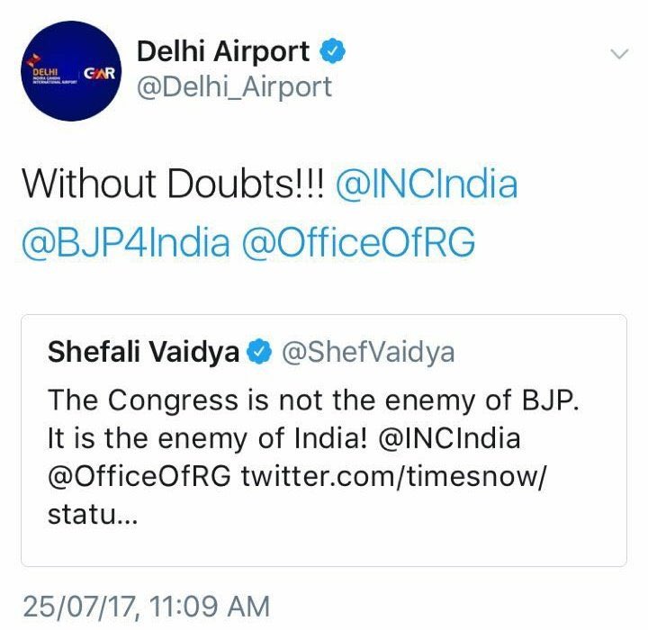 ट्विटर पर एक यूजर ने मंगलवार की सुबह अपने काउंट पर लिखा- कांग्रेस भाजपा का दुश्मन नहीं है। यह भारत का दुश्मन है। इस यूजर के ट्वीट पर पर दिल्ली एयरपोर्ट के ट्विटर अकाउंट से लिखा गया- बिना किसी संदेह के। इसके बाद यह ट्वीट सोशल मीडिया पर वायरल हो गया। यूजर्स दिल्ली एयरपोर्ट को ट्रोल करने लगे।