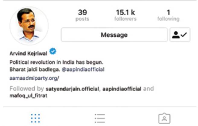 आम आदमी पार्टी के सोशल मीडिया रणनीतिकार अंकित लाल कहते हैं-हम इसे अधिक से अधिक तस्वीर वाला अकाउंट बनाना चाहते हैं। केजरीवाल इसे राजनीतिक व्यक्ति का नहीं बल्कि दिल्लीवासी का पेज बनाना चाहते हैं। केजरीवाल का फेसबुक पेज 70 लाख लोग फॉलो करते हैं। वहीं ट्विटर पर उनके 13.6 मिलियन फॉलोवर्स हैं। आम आदमी पार्टी के नेता अक्सर फेसबुक लाइव के जरिए जनता से संवाद स्थापित करतेहं। अंकित लाल के मुताबिक फेसबुक के जरिए बड़े समूह से संवाद स्थापित होता है, जबकि ट्विटर के जरिए राजनीतिक विचार व्यक्त होते हैं। जबकि इंस्टाग्राम अकाउंट के जरिए हम सिर्फ अरविंद केजरीवाल की व्यक्तिगत रुचियों को जाहिर करना चाहते हैं।