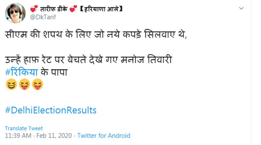 #रिंकिया का पापा#मनोज_तिवारी pic.twitter.com/Qt7eq5SeXV— Rajesh Yadav (@RajeshY16224979) February 11, 2020