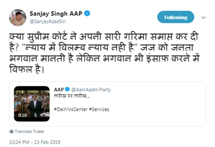 संजय सिंह ने इसके बाद आप के इसी वीडियो वाले ट्वीट को रीट्वीट किया और लिखा, “क्या सुप्रीम कोर्ट ने अपनी सारी गरिमा समाप्त कर दी है? न्याय में देर न्याय नहीं है। जज को जनता भगवान मानती है, पर भगवान भी इंसाफ करने में विफल हैं।” यह रहा सिंह का ट्वीट-