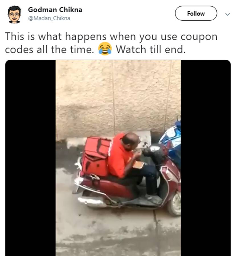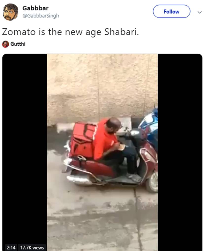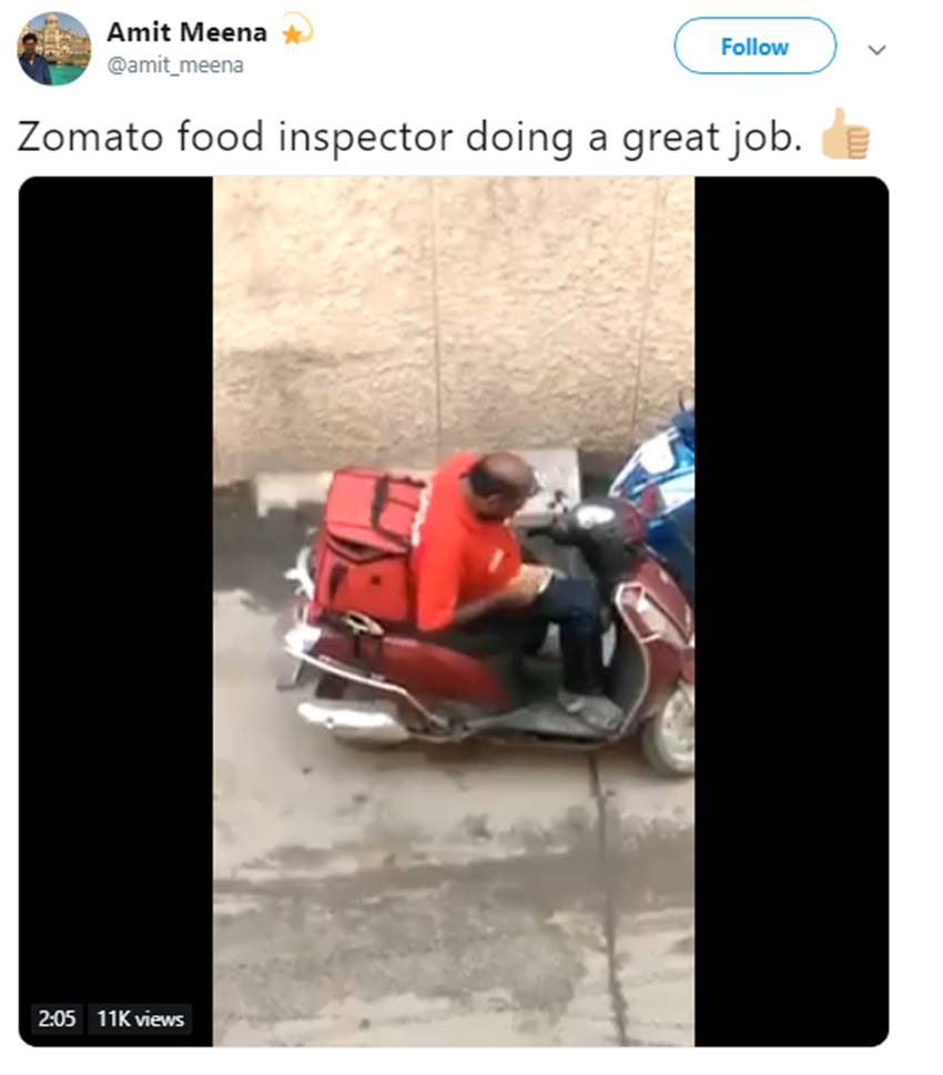 लेकिन अचानक वो सड़क किनारे अपना स्कूटर रोक देता है। इसके बाद यह डिलीवरी ब्वॉय ऑर्डर किये गए खाने को खोलता है और इस खाने को खाने लगता है। खाना खाने के बाद कंपनी का यह कर्मचारी खाने को दोबारा पैक कर देता है। इसके बाद वो दूसरे पैकेट को भी खोलता है और इसमें से भी खाने के बाद उसे उसी तरह पैक कर रख देता है और फिर खाने की डिलीवरी देने निकल जाता है।
