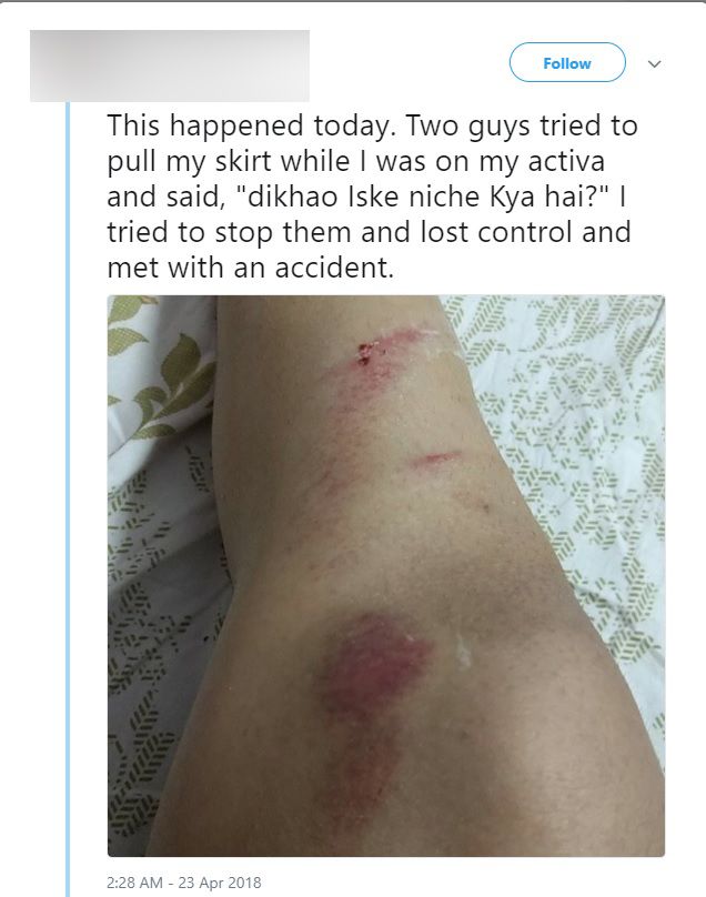 इस महिला मॉडल ने अपने ट्विटर अकाउंट से अपने जख्मी पैर की तस्वीर शेयर करते हुए लिखा- ये मेरे साथ आज हुआ। मैं स्कूटी से कहीं जा रही थी तभी बीच सड़क दो लड़के मेरी स्कर्ट खींचने लगे। वो लड़के स्कर्ट खींचते हुए कह रहे थे कि दिखाओ इसके नीचे क्या है। मैंने उनसे बचने की कोशिश की और स्कूटी लेकर गिर पड़ी।