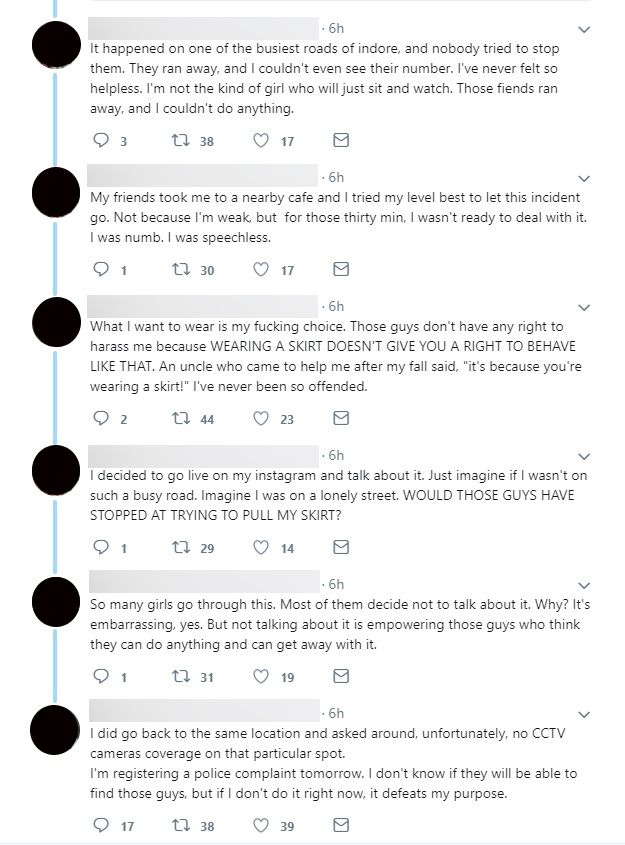 मॉडल ने ये अपने अगले ट्वीट में लिखा कि ये सबकुछ मेरे साथ इंदौर की एक भीड़-भाड़ वाली सड़क पर हुआ लेकिन कोई मेरी मदद को सामने नहीं आया। ये बदमाश जब भीड़-भाड़ वाली जगह पर मेरी स्कर्ट खींच सकते हैं तो सुनसान सड़क पर पता नहीं क्या कर देंगे।