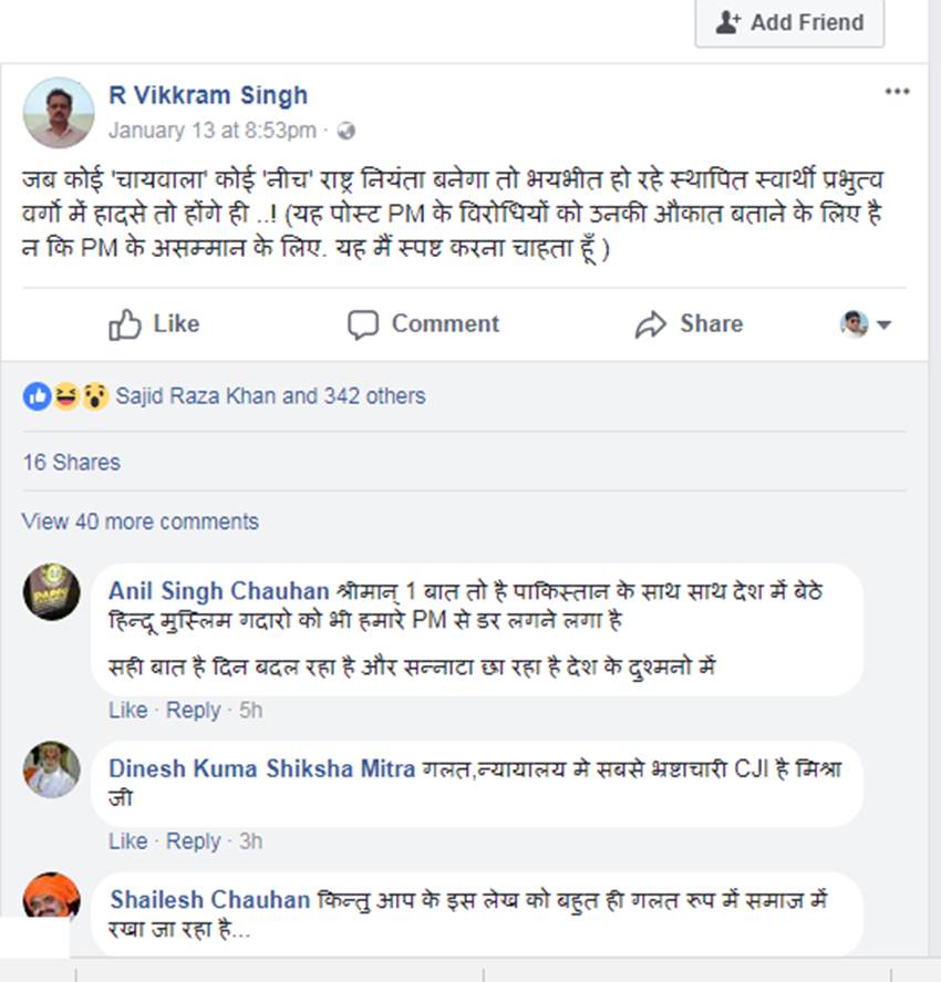 13 जनवरी को प्रधानमंत्री नरेंद्र मोदी से जुड़ी एक पोस्ट उन्होंने लिखी। हाल में जब उनकी कासगंज की घटना को लेकर पोस्ट वायरल हुई तो लोगों ने इस पोस्ट को कुछ और अर्थ निकालकर वायरल करना शुरू कर दिया। इसमें चायवाला और नीच शब्द का प्रयोग था। बता दें, हाल में कांग्रेस की ओर से मोदी को ‘चायवाला’ और मणिशंकर अय्यर की ओर से ‘नीच’ कहा गया था। हाल में जब इस पोस्ट को लोगों ने वायरल करनी शुरू की तो आईएएस राघवेंद्र विक्रम सिंह ने बाद मे पोस्ट को एडिट कर सफाई दी कि-यह पोस्ट उन्होंने प्रधानमंत्री नरेंद्र मोदी के विरोधियों को औकात दिखाने के लिए लिखी है न कि उनके असम्मान में। राघवेंद्र सिंह की पोस्ट कुछ यूं थी- ” जब कोई ‘चायवाला’ कोई ‘नीच’ राष्ट्र नियंता बनेगा तो भयभीत हो रहे स्थापित स्वार्थी प्रभुत्व वर्गो में हादसे तो होंगे ही ..! ”