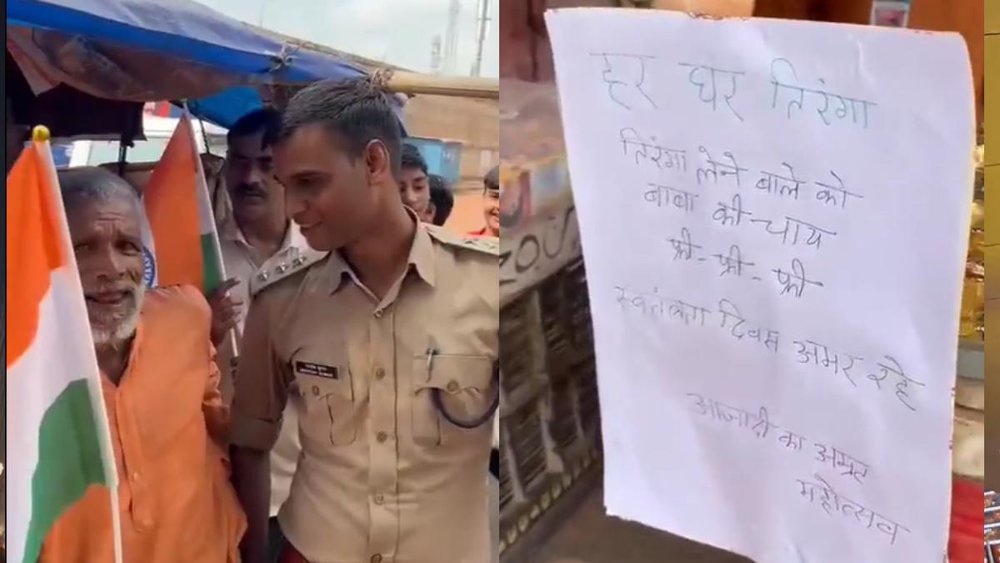 मध्य प्रदेश के DSP संतोष पटेल ने वीडियो शेयर किया है, जिसमें वह एक बुजुर्ग से बात कर रहे हैं। बुजुर्ग वीडियो में कह रहे हैं कि तिरंगा खरीदने पर बाबा की चाय फ्री दी जाएगी। इतना ही नहीं, उन्होंने अपनी दुकान पर इसे एक कागज पर लिखकर चिपका रखे हैं। बाबा ने बताया कि उनके पास एक तिरंगा 20 का है और एक 50 रुपए का है।